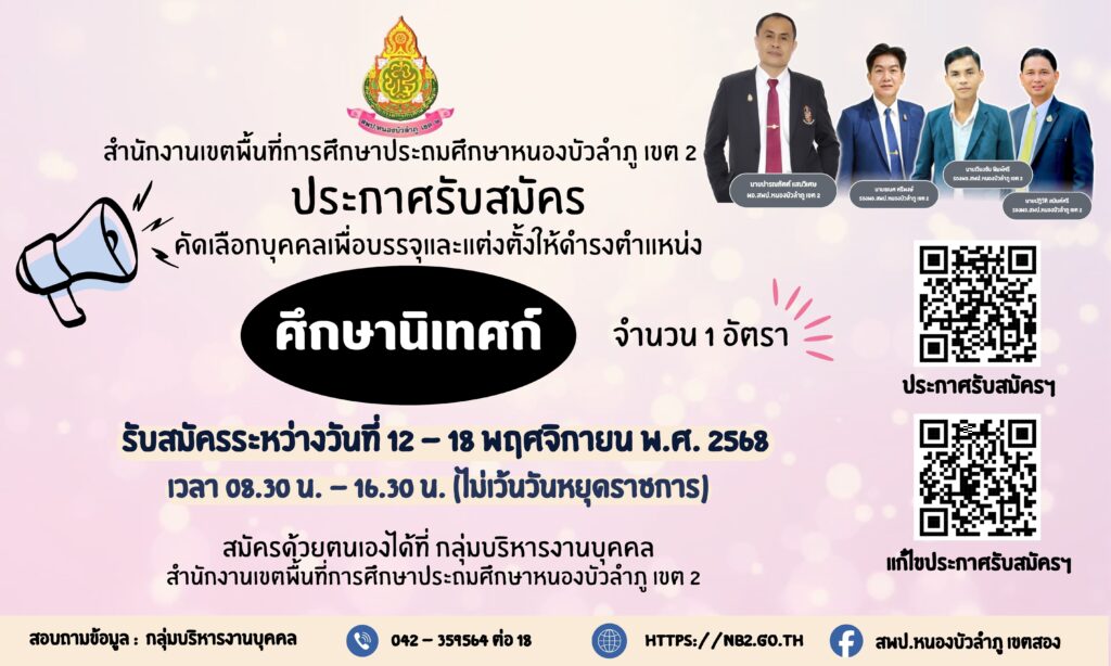 ประกาศ อ.ก.ค.ศ. เขตพื้นที่การศึกษาประถมศึกษาหนองบัวลำภู เขต 2 เรื่อง แก้ไขประกาศรับสมัครคัดเลือกบุคคลเพื่อบรรจุและแต่งตั้งให้ดำรงตำแหน่งศึกษานิเทศก์ สังกัดสำนักงานคณะกรรมการการศึกษาขั้นพื้นฐาน ปี พ.ศ. 2568