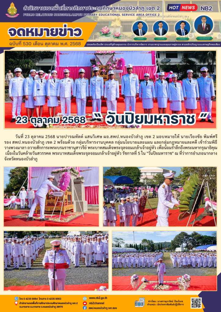 วันที่ 23 ตุลาคม 2568 นายปารณทัตต์ แสนวิเศษ ผอ.สพป.หนองบัวลำภู เขต 2 มอบหมายให้ นายเวียงชัย พิมพ์ศรี รอง สพป.หนองบัวลำภู เขต 2 พร้อมด้วย กลุ่มบริหารงานบุคคล กลุ่มนโยบายและแผน และกลุ่มกฎหมายและคดี เข้าร่วมพิธีวางพวงมาลา ถวายสักการะพระบรมราชานุสาวรีย์ พระบาทสมเด็จพระจุลจอมเกล้าเจ้าอยู่หัว เพื่อน้อมรำลึกถึงพระมหากรุณาธิคุณเนื่องในวันคล้ายวันสวรรคต พระบาทสมเด็จพระจุลจอมเกล้าเจ้าอยู่หัว รัชกาลที่ 5 ใน “วันปิยมหาราช” ณ ที่ว่าการอำเภอนากลาง จังหวัดหนองบัวลำภู