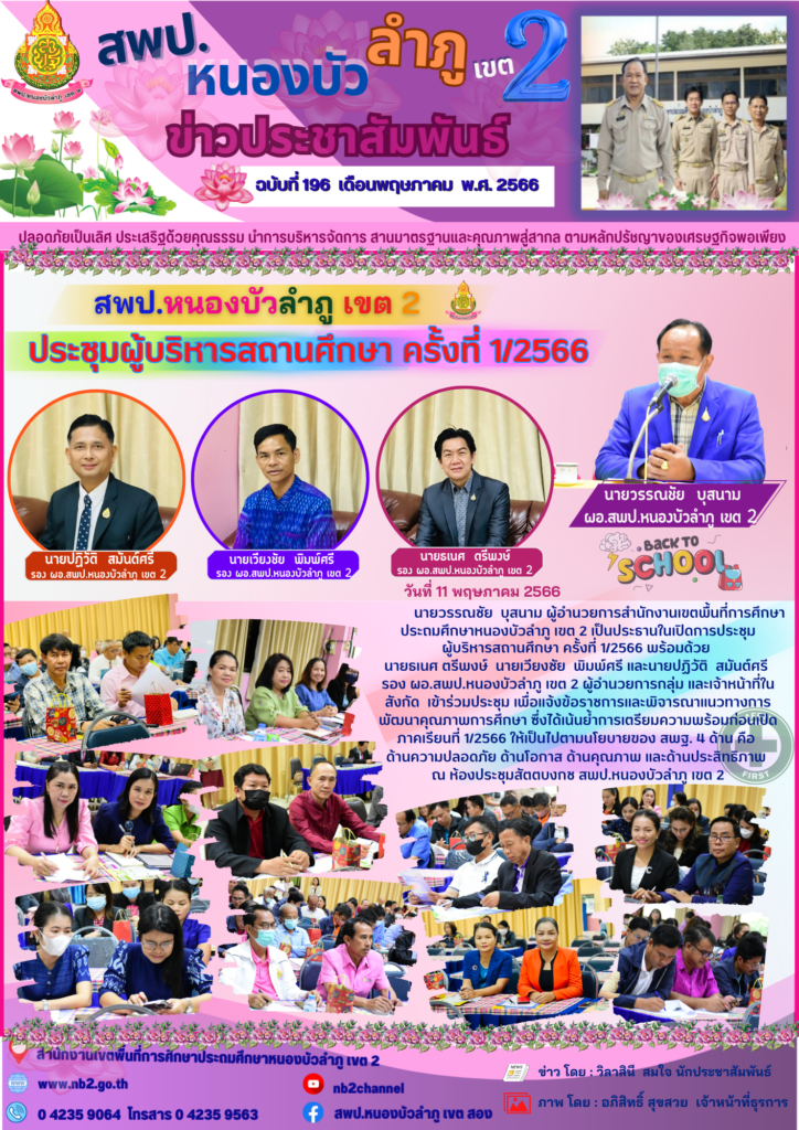 วันพฤหัสบดีที่ 11 พฤษภาคม 2566 นายวรรณชัย บุสนาม ผู้อำนวยการสำนักงานเขตพื้นที่การศึกษาประถมศึกษาหนองบัวลำภู เขต 2 เป็นประธานในเปิดการประชุมผู้บริหารสถานศึกษา ครั้งที่ 1/2566 พร้อมด้วย นายธเนศ ตรีพงษ์ นายเวียงชัย พิมพ์ศรี และนายปฏิวัติ สมันต์ศรี รอง ผอ.สพป.หนองบัวลำภู เขต 2 ผู้อำนวยการกลุ่ม และเจ้าหน้าที่ในสังกัด เข้าร่วมประชุม เพื่อแจ้งข้อราชการและพิจารณาแนวทางการพัฒนาคุณภาพการศึกษา ซึ่งได้เน้นย้ำการเตรียมความพร้อมก่อนเปิดภาคเรียนที่ 1/2566 ให้เป็นไปตามนโยบายของ สพฐ. 4 ด้าน คือ ด้านความปลอดภัย ด้านโอกาส ด้านคุณภาพ และด้านประสิทธิภาพ ณ ห้องประชุมสัตตบงกช สพป.หนองบัวลำภู เขต 2