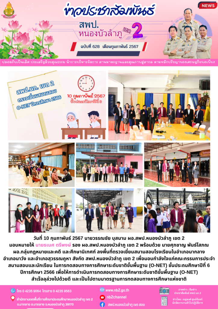 วันที่ 10 กุมภาพันธ์ 2567 นายวรรณชัย บุสนาม ผอ.สพป.หนองบัวลำภู เขต 2 มอบหมายให้ นายธเนศ ตรีพงษ์ รอง ผอ.สพป.หนองบัวลำภู เขต 2 พร้อมด้วย นายศุภชาญ พันธ์โสภณ ผอ.กลุ่มกฎหมายและคดี และศึกษานิเทศก์ ลงพื้นที่ตรวจเยี่ยมสนามสอบโรงเรียนในอำเภอนากลาง อำเภอนาวัง และอำเภอสุวรรณคูหา สังกัด สพป.หนองบัวลำภู เขต 2 เพื่อมอบกำลังใจแก่คณะกรรมการประจำสนามสอบและนักเรียน ในการทดสอบทางการศึกษาระดับชาติขั้นพื้นฐาน (O-NET) ชั้นประถมศึกษาปีที่ 6 ปีการศึกษา 2566 เพื่อให้การดำเนินการทดสอบทางการศึกษาระดับชาติขั้นพื้นฐาน (O-NET) สำเร็จลุล่วงไปด้วยดี และเป็นไปตามมาตรฐานการทดสอบทางการศึกษาแห่งชาติ