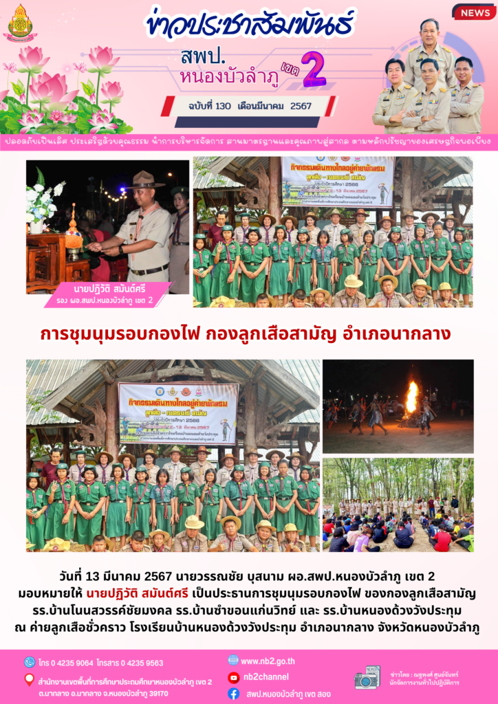 วันที่ 13 มีนาคม 2567 นายวรรณชัย บุสนาม ผอ.สพป.หนองบัวลำภู เขต 2 มอบหมายให้ นายปฏิวัติ สมันต์ศรี เป็นประธานการชุมนุมรอบกองไฟ ของกองลูกเสือสามัญ รร.บ้านโนนสวรรค์ชัยมงคล รร.บ้านซำขอนแก่นวิทย์ และ รร.บ้านหนองด้วงวังประทุม ณ ค่ายลูกเสือชั่วคราว โรงเรียนบ้านหนองด้วงวังประทุม อำเภอนากลาง จังหวัดหนองบัวลำภู