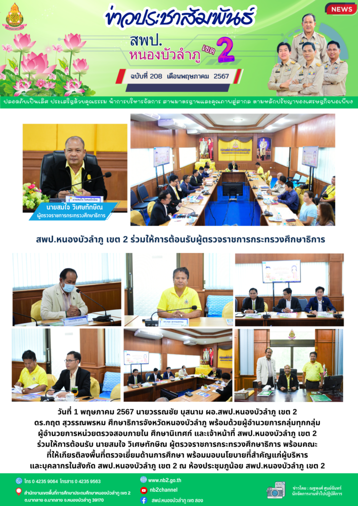 วันที่ 1 พฤษภาคม 2567 นายวรรณชัย บุสนาม ผอ.สพป.หนองบัวลำภู เขต 2 ,ดร.กฤต สุวรรณพรหม ศึกษาธิการจังหวัดหนองบัวลำภู พร้อมด้วยผู้อำนวยการกลุ่มทุกกลุ่ม ผู้อำนวยการหน่วยตรวจสอบภายใน ศึกษานิเทศก์ และเจ้าหน้าที่ สพป.หนองบัวลำภู เขต 2 ร่วมให้การต้อนรับ นายสมใจ วิเศษทักษิณ ผู้ตรวจราชการกระทรวงศึกษาธิการ พร้อมคณะ ที่ให้เกียรติลงพื้นที่ตรวจเยี่ยมด้านการศึกษา พร้อมมอบนโยบายที่สำคัญแก่ผู้บริหาร และบุคลากรในสังกัด สพป.หนองบัวลำภู เขต 2 ณ ห้องประชุมภูน้อย สพป.หนองบัวลำภู เขต 2