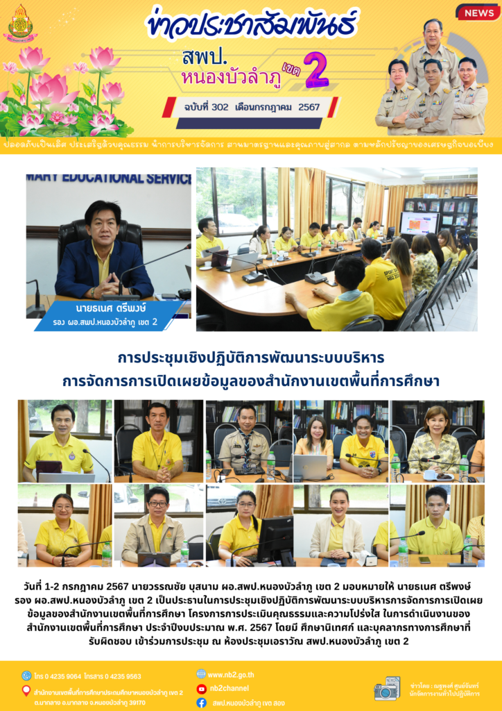 วันที่ 1-2 กรกฎาคม 2567 นายวรรณชัย บุสนาม ผอ.สพป.หนองบัวลำภู เขต 2 มอบหมายให้ นายธเนศ ตรีพงษ์ รอง ผอ.สพป.หนองบัวลำภู เขต 2 เป็นประธานในการประชุมเชิงปฏิบัติการพัฒนาระบบบริหารการจัดการการเปิดเผยข้อมูลของสำนักงานเขตพื้นที่การศึกษา โครงการการประเมินคุณธรรมและความโปร่งใส ในการดำเนินงานของสำนักงานเขตพื้นที่การศึกษา ประจำปีงบประมาณ พ.ศ. 2567 โดยมี ศึกษานิเทศก์ และบุคลากรทางการศึกษาที่รับผิดชอบ เข้าร่วมการประชุม ณ ห้องประชุมเอราวัณ สพป.หนองบัวลำภู เขต 2