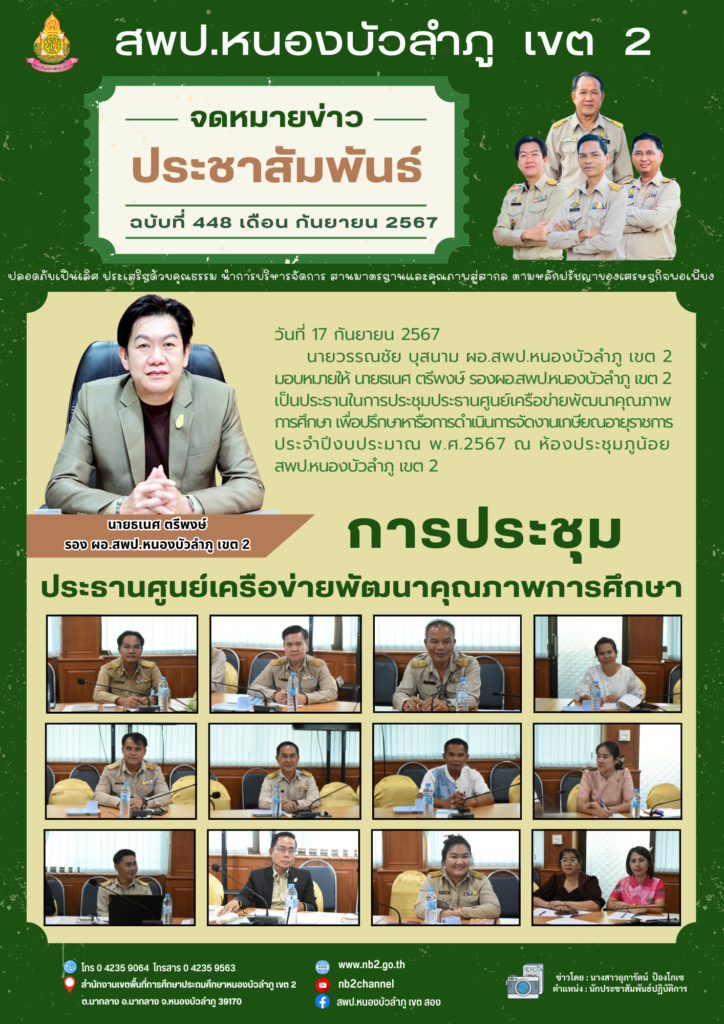 นายวรรณชัย บุสนาม ผอ.สพป.หนองบัวลำภู เขต 2 มอบหมายให้ นายธเนศ ตรีพงษ์ รองผอ.สพป.หนองบัวลำภู เขต 2 เป็นประธานในการประชุมประธานศูนย์เครือข่ายพัฒนาคุณภาพการศึกษา เพื่อปรึกษาหารือการดำเนินการจัดงานเกษียณอายุราชการ ประจำปีงบประมาณ พ.ศ.2567 ณ ห้องประชุมภูน้อยสพป.หนองบัวลำภู เขต 2