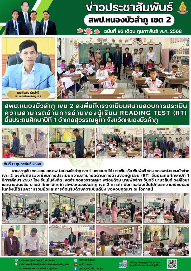 วันที่ 11 กุมภาพันธ์ 2568 นายชาญชัย ทองแสน ผอ.สพป.หนองบัวลำภู เขต 2 มอบหมายให้ นายเวียงชัย พิมพ์ศรี รอง ผอ.สพป.หนองบัวลำภู เขต 2 ลงพื้นที่ตรวจเยี่ยมการประเมินความสามารถด้านการอ่านของผู้เรียน (RT) ชั้นประถมศึกษาปีที่ 1 ปีการศึกษา 2567 โรงเรียนในสังกัด เขตอำเภอสุวรรณคูหา พร้อมด้วย นายพัฐจักร วันทวี นายวสันต์ วงค์ไชยา และนายฉัตรชัย นามมี ศึกษานิเทศก์ สพป.หนองบัวลำภู เขต 2 การดำเนินการสอบเป็นไปด้วยความเรียบร้อย ในครั้งนี้ได้รับความร่วมมือและการต้อนรับด้วยความยินดียิ่ง ขอขอบคุณมา ณ โอกาสนี้
