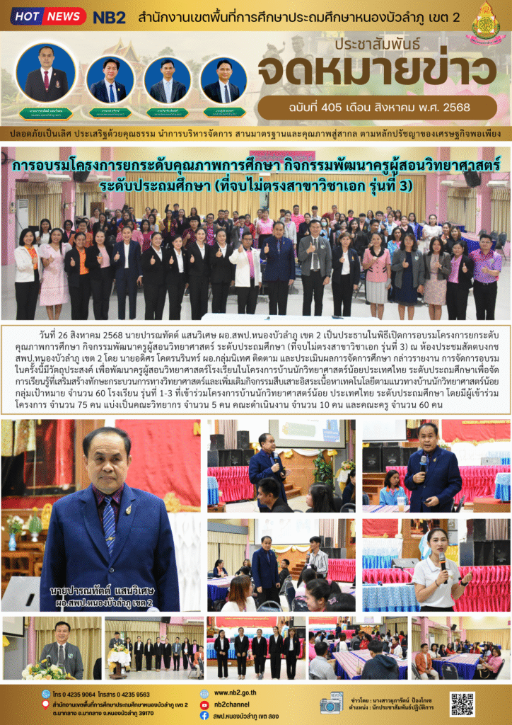 วันที่ 26 สิงหาคม 2568 นายปารณทัตต์ แสนวิเศษ ผอ.สพป.หนองบัวลำภู เขต 2 เป็นประธานในพิธีเปิดการอบรมโครงการยกระดับคุณภาพการศึกษา กิจกรรมพัฒนาครูผู้สอนวิทยาศาสตร์ ระดับประถมศึกษา (ที่จบไม่ตรงสาขาวิชาเอก รุ่นที่ 3) ณ ห้องประชมสัตตบงกช สพป.หนองบัวลำภู เขต 2 โดย นายอดิศร โคตรนรินทร์ ผอ.กลุ่มนิเทศ ติดตาม และประเมินผลการจัดการศึกษา กล่าวรายงาน การจัดการอบรมในครั้งนี้่มีวัตถุประสงค์ เพื่อพัฒนาครูผู้สอนวิทยาศาสตร์โรงเรียนในโครงการบ้านนักวิทยาศาสตร์น้อยประเทศไทย ระดับประถมศึกษาเพื่อจัดการเรียนรู้ที่เสริมสร้างทักษะกระบวนการทางวิทยาศาสตร์และเพิ่มเติมกิจกรรมสืบเสาะอิสระเนื้อหาเทคโนโลยีตามแนวทางบ้านนักวิทยาศาสตร์น้อย กลุ่มเป้าหมาย จำนวน 60 โรงเรียน รุ่นที่ 1-3 ที่เข้าร่วมโครงการบ้านนักวิทยาศาสตร์น้อย ประเทศไทย ระดับประถมศึกษา โดยมีผู้เข้าร่วมโครงการ จำนวน 75 คน แบ่งเป็นคณะวิทยากร จำนวน 5 คน คณะดำเนินงาน จำนวน 10 คน และคณะครู จำนวน 60 คน