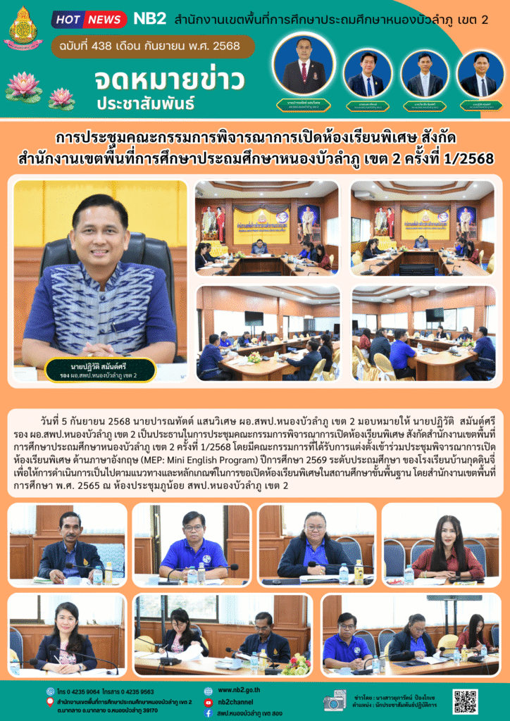 วันที่ 5 กันยายน 2568 นายปารณทัตต์ แสนวิเศษ ผอ.สพป.หนองบัวลำภู เขต 2 มอบหมายให้ นายปฏิวัติ สมันต์ศรี รอง ผอ.สพป.หนองบัวลำภู เขต 2 เป็นประธานในการประชุมคณะกรรมการพิจารณาการเปิดห้องเรียนพิเศษ สังกัดสำนักงานเขตพื้นที่การศึกษาประถมศึกษาหนองบัวลำภู เขต 2 ครั้งที่ 1/2568 โดยมีคณะกรรมการที่ได้รับการแต่งตั้งเข้าร่วมประชุมพิจารณาการเปิดห้องเรียนพิเศษ ด้านภาษาอังกฤษ (MEP: Mini English Program) ปีการศึกษา 2569 ระดับประถมศึกษา ของโรงเรียนบ้านกุดดินจี่ เพื่อให้การดำเนินการเป็นไปตามแนวทางและหลักเกณฑ์ในการขอเปิดห้องเรียนพิเศษในสถานศึกษาขั้นพื้นฐาน โดยสำนักงานเขตพื้นที่การศึกษา พ.ศ. 2565 ณ ห้องประชุมภูน้อย สพป.หนองบัวลำภู เขต 2