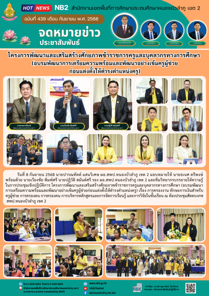วันที่ 8 กันยายน 2568 นายปารณทัตต์ แสนวิเศษ ผอ.สพป.หนองบัวลำภู เขต 2 มอบหมายให้ นายธเนศ ตรีพงษ์ พร้อมด้วย นายเวียงชัย พิมพ์ศรี นายปฏิวัติ สมันต์ศรี รอง ผอ.สพป.หนองบัวลำภู เขต 2 และทีมวิทยากรบรรยายให้ความรู้ในการประชุมเชิงปฏิบัติการ โครงการพัฒนาและเสริมสร้างศักยภาพข้าราชการครูและบุคลากรทางการศึกษา (อบรมพัฒนาการเตรียมความพร้อมและพัฒนาอย่างเข้มครูผู้ช่วยก่อนแต่งตั้งให้ดำรงตำแหน่งครู) เรื่อง การครองงาน ทักษะการเงินสำหรับครูผู้ช่วย การครองตน การครองคน การบริหารหลักสูตรและการจัดการเรียนรู้ และการวิจัยในชั้นเรียน ณ ห้องประชุมสัตตบงกช สพป.หนองบัวลำภู เขต 2