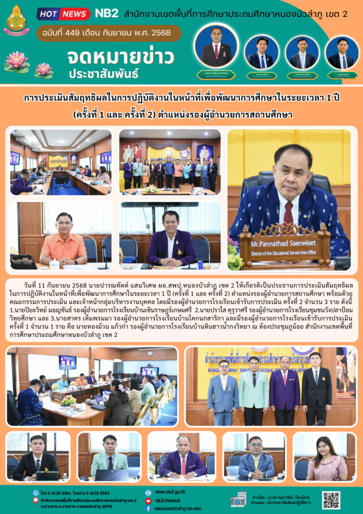 วันที่ 11 กันยายน 2568 นายปารณทัตต์ แสนวิเศษ ผอ.สพป.หนองบัวลำภู เขต 2 ให้เกียรติเป็นประธานการประเมินสัมฤทธิผลในการปฏิบัติงานในหน้าที่เพื่อพัฒนาการศึกษาในระยะเวลา 1 ปี (ครั้งที่ 1 และ ครั้งที่ 2) ตำแหน่งรองผู้อำนวยการสถานศึกษา พร้อมด้วย คณะกรรมการประเมิน และเจ้าหน้ากลุ่มบริหารงานบุคคล โดยมีรองผู้อำนวยการโรงเรียนเข้ารับการประเมิน ครั้งที่ 2 จำนวน 3 ราย ดังนี้ 1.นายปิยะวิทย์ มอญขันธ์ รองผู้อำนวยการโรงเรียนบ้านเซินราษฎร์เกษมศรี 2.นายปราใส คุรุวาศรี รองผู้อำนวยการโรงเรียนชุมชนวังปลาป้อมวิทยศึกษา และ 3.นายสาคร เห็มพรมมา รองผู้อำนวยการโรงเรียนบ้านโคกนกสาริกา และมีรองผู้อำนวยการโรงเรียนเข้ารับการประเมิน ครั้งที่ 1 จำนวน 1 ราย คือ นายทองม้วน แก้วก่า รองผู้อำนวยการโรงเรียนบ้านหินฮาวน้ำกงวิทยา ณ ห้องประชุมภูน้อย สำนักงานเขตพื้นที่การศึกษาประถมศึกษาหนองบัวลำภู เขต 2