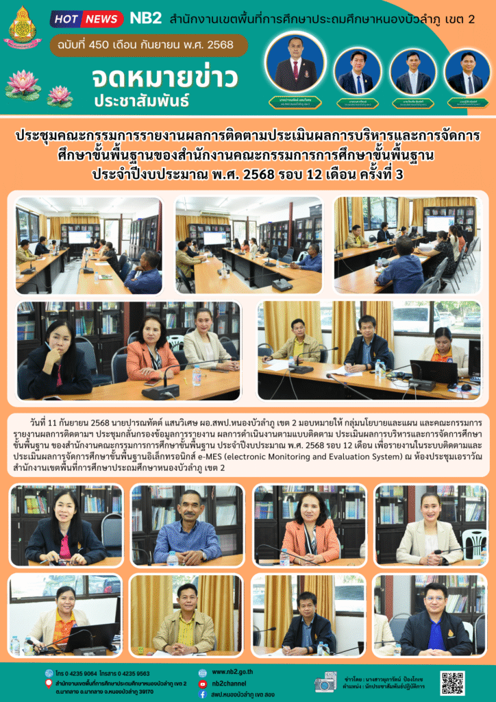 วันที่ 11 กันยายน 2568 นายปารณทัตต์ แสนวิเศษ ผอ.สพป.หนองบัวลำภู เขต 2 มอบหมายให้ กลุ่มนโยบายและแผน และคณะกรรมการรายงานผลการติดตามฯ ประชุมกลั่นกรองข้อมูลการรายงาน ผลการดำเนินงานตามแบบติดตาม ประเมินผลการบริหารและการจัดการศึกษาขั้นพื้นฐาน ของสำนักงานคณะกรรมการการศึกษาขั้นพื้นฐาน ประจำปีงบประมาณ พ.ศ. 2568 รอบ 12 เดือน เพื่อรายงานในระบบติดตามและประเมินผลการจัดการศึกษาขั้นพื้นฐานอิเล็กทรอนิกส์ e-MES (electronic Monitoring and Evaluation System) ณ ห้องประชุมเอราวัณ สำนักงานเขตพื้นที่การศึกษาประถมศึกษาหนองบัวลำภู เขต 2