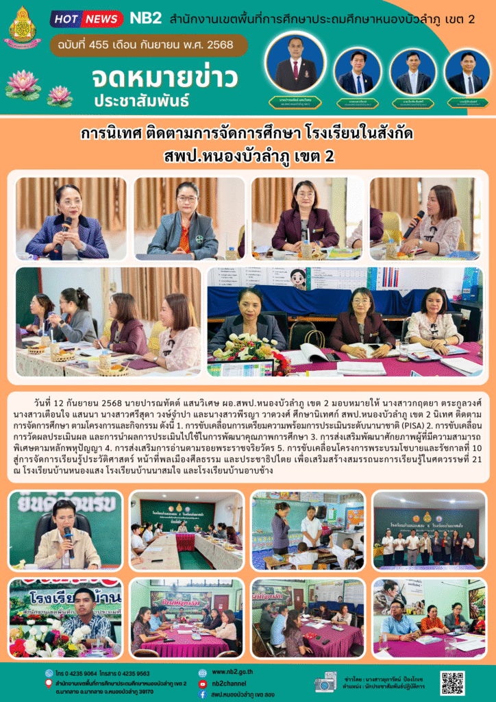 วันที่ 12 กันยายน 2568 นายปารณทัตต์ แสนวิเศษ ผอ.สพป.หนองบัวลำภู เขต 2 มอบหมายให้ นางสาวกฤตยา ตระกูลวงศ์ นางสาวเตือนใจ แสนนา นางสาวศรีสุดา วงษ์จำปา และนางสาวพีรญา วาดวงศ์ ศึกษานิเทศก์ สพป.หนองบัวลำภู เขต 2 นิเทศ ติดตาม การจัดการศึกษา ตามโครงการและกิจกรรม ดังนี้ 1. การขับเคลื่อนการเตรียมความพร้อมการประเมินระดับนานาชาติ (PISA) 2. การขับเคลื่อนการวัดผลประเมินผล และการนำผลการประเมินไปใช้ในการพัฒนาคุณภาพการศึกษา 3. การส่งเสริมพัฒนาศักยภาพผู้ที่มีความสามารถพิเศษตามหลักพหุปัญญา 4. การส่งเสริมการอ่านตามรอยพระราชจริยวัตร 5. การขับเคลื่อนโครงการพระบรมโชบายและรัชกาลที่ 10 สู่การจัดการเรียนรู้ประวัติศาสตร์ หน้าที่พลเมืองศีลธรรม และประชาธิปไตย เพื่อเสริมสร้างสมรรถนะการเรียนรู้ในศตวรรษที่ 21 ณ โรงเรียนบ้านหนองแสง โรงเรียนบ้านนาสมใจ และโรงเรียนบ้านอาบช้าง
