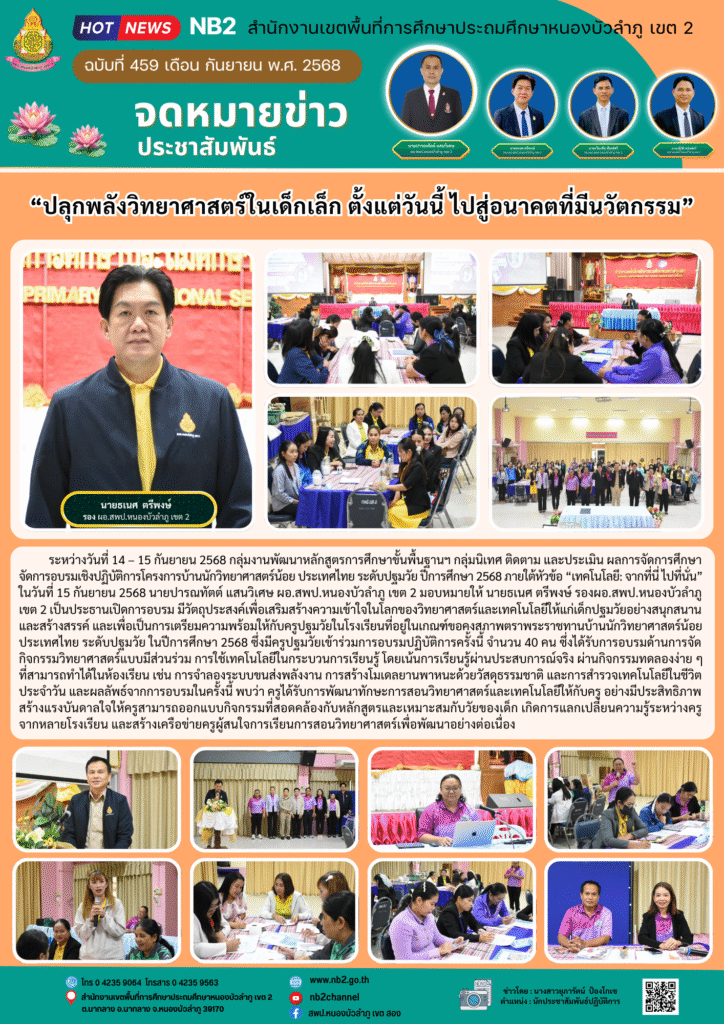 ระหว่างวันที่ 14 – 15 กันยายน 2568 กลุ่มงานพัฒนาหลักสูตรการศึกษาขั้นพื้นฐานฯ กลุ่มนิเทศ ติดตาม และประเมิน ผลการจัดการศึกษาจัดการอบรมเชิงปฏิบัติการโครงการบ้านนักวิทยาศาสตร์น้อย ประเทศไทย ระดับปฐมวัย ปีการศึกษา 2568 ภายใต้หัวข้อ “เทคโนโลยี: จากที่นี่ ไปที่นั่น” ในวันที่ 15 กันยายน 2568 นายปารณทัตต์ แสนวิเศษ ผอ.สพป.หนองบัวลำภู เขต 2 มอบหมายให้ นายธเนศ ตรีพงษ์ รองผอ.สพป.หนองบัวลำภู เขต 2 เป็นประธานเปิดการอบรม มีวัตถุประสงค์เพื่อเสริมสร้างความเข้าใจในโลกของวิทยาศาสตร์และเทคโนโลยีให้แก่เด็กปฐมวัยอย่างสนุกสนานและสร้างสรรค์ และเพื่อเป็นการเตรียมความพร้อมให้กับครูปฐมวัยในโรงเรียนที่อยู่ในเกณฑ์ขอคงสภาพตราพระราชทานบ้านนักวิทยาศาสตร์น้อยประเทศไทย ระดับปฐมวัย ในปีการศึกษา 2568 ซึ่งมีครูปฐมวัยเข้าร่วมการอบรมปฏิบัติการครั้งนี้ จำนวน 40 คน ซึ่งได้รับการอบรมด้านการจัดกิจกรรมวิทยาศาสตร์แบบมีส่วนร่วม การใช้เทคโนโลยีในกระบวนการเรียนรู้ โดยเน้นการเรียนรู้ผ่านประสบการณ์จริง ผ่านกิจกรรมทดลองง่าย ๆ ที่สามารถทำได้ในห้องเรียน เช่น การจำลองระบบขนส่งพลังงาน การสร้างโมเดลยานพาหนะด้วยวัสดุธรรมชาติ และการสำรวจเทคโนโลยีในชีวิตประจำวัน และผลลัพธ์จากการอบรมในครั้งนี้ พบว่า ครูได้รับการพัฒนาทักษะการสอนวิทยาศาสตร์และเทคโนโลยีให้กับครู อย่างมีประสิทธิภาพสร้างแรงบันดาลใจให้ครูสามารถออกแบบกิจกรรมที่สอดคล้องกับหลักสูตรและเหมาะสมกับวัยของเด็ก เกิดการแลกเปลี่ยนความรู้ระหว่างครูจากหลายโรงเรียน และสร้างเครือข่ายครูผู้สนใจการเรียนการสอนวิทยาศาสตร์เพื่อพัฒนาอย่างต่อเนื่อง