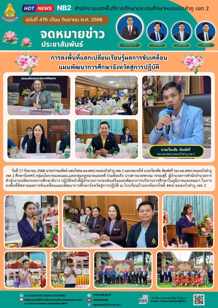 วันที่ 17 กันยายน 2568 นายปารณทัตต์ แสนวิเศษ ผอ.สพป.หนองบัวลำภู เขต 2 มอบหมายให้ นายเวียงชัย พิมพ์ศรี รอง ผอ.สพป.หนองบัวลำภู เขต 2 ศึกษานิเทศก์,กลุ่มนโยบายและแผน,และกลุ่มกฎหมายและคดี ร่วมต้อนรับ นางสาวนวลพรรณ วรรณสุธี ผู้อำนวยการสำนักอำนวยการสำนักงานปลัดกระทรวงศึกษาธิการ ปฏิบัติหน้าที่ผู้อำนวยการกองส่งเสริมและพัฒนาการบริหารการศึกษาในภูมิภาคและคณะฯ ในการลงพื้นที่ติดตามผลการขับเคลื่อนแผนพัฒนาการศึกษาจังหวัดสู่การปฏิบัติ ณ โรงเรียนบ้านกกค้อกกโพธิ์ สพป.หนองบัวลำภู เขต 2