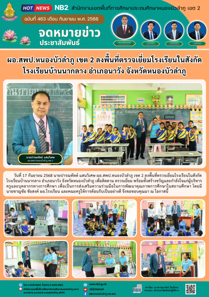 วันที่ 17 กันยายน 2568 นายปารณทัตต์ แสนวิเศษ ผอ.สพป.หนองบัวลำภู เขต 2 ลงพื้นที่ตรวจเยี่ยมโรงเรียนในสังกัดโรงเรียนบ้านนากลาง อำเภอนาวัง จังหวัดหนองบัวลำภู เพื่อติดตาม ตรวจเยี่ยม พร้อมทั้งสร้างขวัญและกำลังใจแก่ผู้บริหารครูและบุคลากรทางการศึกษา เพื่อเป็นการส่งเสริมความร่วมมือในการพัฒนาคุณภาพการศึกษาในสถานศึกษา โดยมี นายชาญชัย ชัยสงค์ ผอ.โรงเรียน และคณะครูให้การต้อนรับเป็นอย่างดี จึงขอขอบคุณมา ณ โอกาสนี้