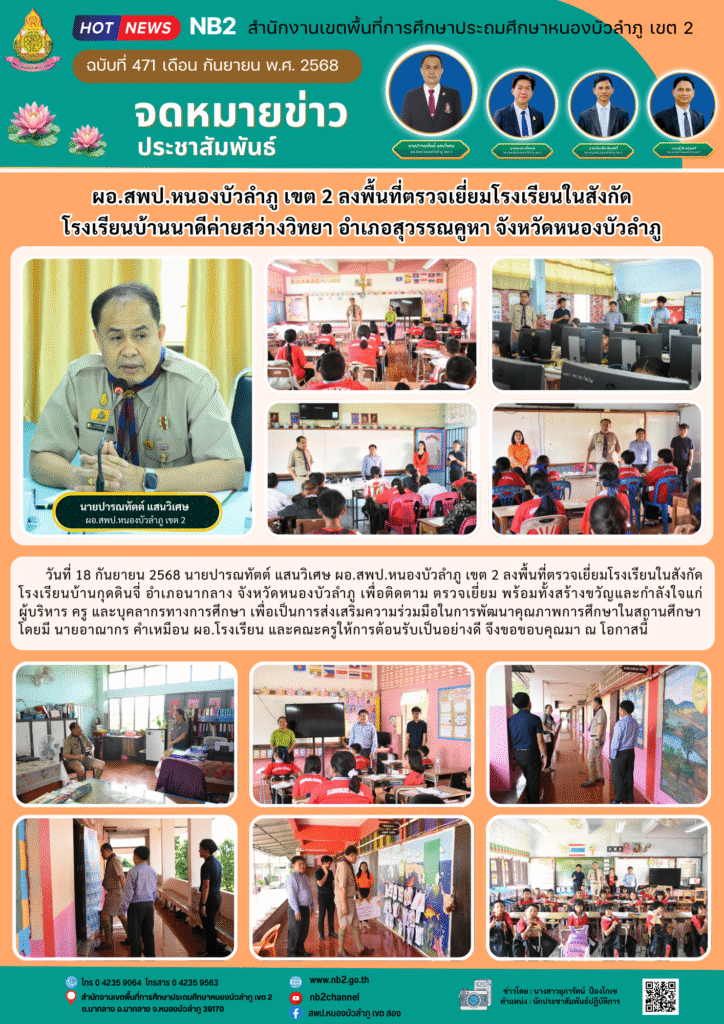 วันที่ 18 กันยายน 2568 นายปารณทัตต์ แสนวิเศษ ผอ.สพป.หนองบัวลำภู เขต 2 ลงพื้นที่ตรวจเยี่ยมโรงเรียนในสังกัดโรงเรียนบ้านกุดดินจี่ อำเภอนากลาง จังหวัดหนองบัวลำภู เพื่อติดตาม ตรวจเยี่ยม พร้อมทั้งสร้างขวัญและกำลังใจแก่ผู้บริหาร ครู และบุคลากรทางการศึกษา เพื่อเป็นการส่งเสริมความร่วมมือในการพัฒนาคุณภาพการศึกษาในสถานศึกษา โดยมี นายอาณากร คำเหมือน ผอ.โรงเรียน และคณะครูให้การต้อนรับเป็นอย่างดี จึงขอขอบคุณมา ณ โอกาสนี้
