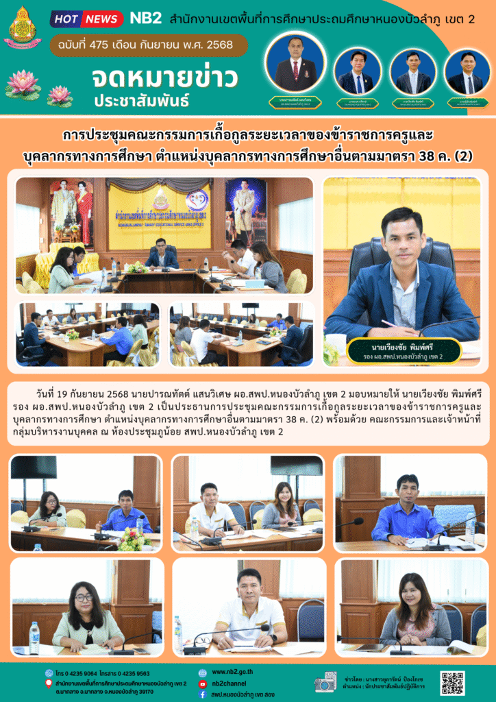 วันที่ 19 กันยายน 2568 นายปารณทัตต์ แสนวิเศษ ผอ.สพป.หนองบัวลำภู เขต 2 มอบหมายให้ นายเวียงชัย พิมพ์ศรี รอง ผอ.สพป.หนองบัวลำภู เขต 2 เป็นประธานการประชุมคณะกรรมการเกื้อกูลระยะเวลาของข้าราชการครูและบุคลากรทางการศึกษา ตำแหน่งบุคลากรทางการศึกษาอื่นตามมาตรา 38 ค. (2) พร้อมด้วย คณะกรรมการและเจ้าหน้าที่กลุ่มบริหารงานบุคคล ณ ห้องประชุมภูน้อย สพป.หนองบัวลำภู เขต 2