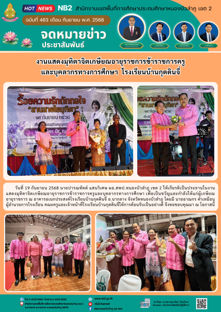 วันที่ 19 กันยายน 2568 นายปารณทัตต์ แสนวิเศษ ผอ.สพป.หนองบัวลำภู เขต 2 ให้เกียรติเป็นประธานในงานแสดงมุทิตาจิตเกษียณอายุราชการข้าราชการครูและบุคลากรทางการศึกษา เพื่อเป็นขวัญและกำลังให้แก่ผู้เกษียณอายุราชการ ณ อาคารอเนกประสงค์โรงเรียนบ้านกุดดินจี่ อ.นากลาง จังหวัดหนองบัวลำภู โดยมี นายอาณกร คำเหมือน ผู้อำนวยการโรงเรียน คณะครูและเจ้าหน้าที่โรงเรียนบ้านกุดดินจี่ให้การต้อนรับเป็นอย่างดี จึงขอขอบคุณมา ณ โอกาสนี้
