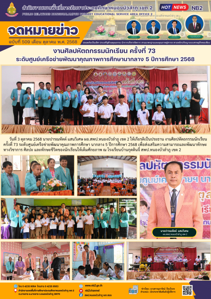 วันที่ 3 ตุลาคม 2568 นายปารณทัตต์ แสนวิเศษ ผอ.สพป.หนองบัวลำภู เขต 2 ให้เกียรติเป็นประธาน งานศิลปหัตถกรรมนักเรียน ครั้งที่ 73 ระดับศูนย์เครือข่ายพัฒนาคุณภาพการศึกษา นากลาง 5 ปีการศึกษา 2568 เพื่อส่งเสริมความสามารถและพัฒนาทักษะทางวิชาการ ศิลปะ และทักษะชีวิตของนักเรียนให้เต็มศักยภาพ ณ โรงเรียนบ้านกุดดินจี่ สพป.หนองบัวลำภู เขต 2