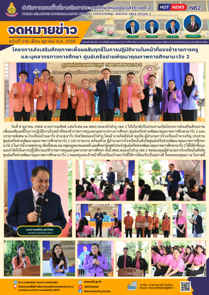 วันที่ 8 ตุลาคม 2568 นายปารณทัตต์ แสนวิเศษ ผอ.สพป.หนองบัวลำภู เขต 2 ให้เกียรติเป็นประธานเปิดโครงการส่งเสริมศักยภาพเพื่อผลสัมฤทธิ์ในการปฏิบัติงานในหน้าที่ของข้าราชการครูและบุคลากรทางการศึกษา ศูนย์เครือข่ายพัฒนาคุณภาพการศึกษานาวัง 2 และบรรยายพิเศษ ณ โรงเรียนบ้านผาวัง อำเภอนาวัง จังหวัดหนองบัวลำภู โดยมี นายกิตตินันท์ ทุมปัด ผู้อำนวยการโรงเรียนบ้านาเจริญ ประธานศูนย์เครือข่ายพัฒนาคุณภาพการศึกษานาวัง 2 กล่าวรายงาน พร้อมด้วย ผู้อำนวยการโรงเรียนในสังกัดศูนย์เครือข่ายพัฒนาคุณภาพการศึกษานาวัง 2 ในการนี้ นายศุภชาญ พันธ์โสภณ ผอ.กลุ่มกฎหมายและคดี และศึกษานิเทศก์ประจำศูนย์เครือข่ายพัฒนาคุณภาพการศึกษานาวัง 2 ได้ให้คำชี้แนะ และกำลังใจในการปฏิบัติงานแก่ข้าราชการครูและบุคลากรทางการศึกษา ทั้งนี้ สพป.หนองบัวลำภู เขต 2 ขอขอบคุณผู้อำนวยการโรงเรียนในสังกัดศูนย์เครือข่ายพัฒนาคุณภาพการศึกษานาวัง 2 คณะครูและเจ้าหน้าที่โรงเรียนบ้านผาวังที่ให้การต้อนรับเป็นอย่างดี จึงขอขอบคุณมา ณ โอกาสนี้