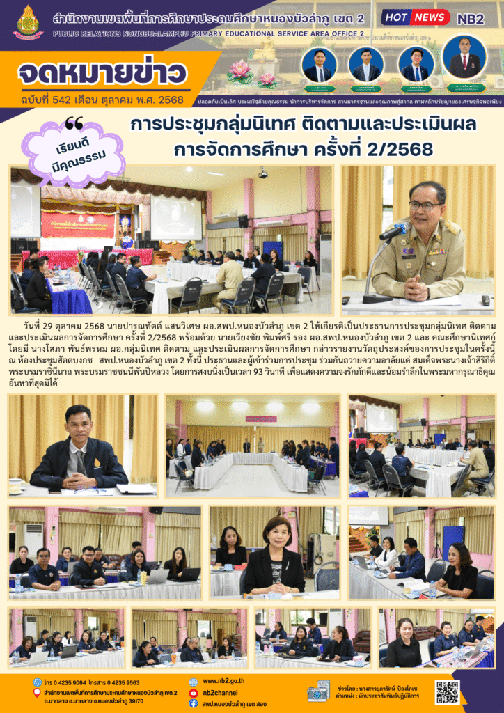 วันที่ 29 ตุลาคม 2568 นายปารณทัตต์ แสนวิเศษ ผอ.สพป.หนองบัวลำภู เขต 2 ให้เกียรติเป็นประธานการประชุมกลุ่มนิเทศ ติดตาม และประเมินผลการจัดการศึกษา ครั้งที่ 2/2568 พร้อมด้วย นายเวียงชัย พิมพ์ศรี รอง ผอ.สพป.หนองบัวลำภู เขต 2 และ คณะศึกษานิเทศก์ โดยมี นางโสภา พันธ์พรหม ผอ.กลุ่มนิเทศ ติดตาม และประเมินผลการจัดการศึกษา กล่าวรายงานวัตถุประสงค์ของการประชุมในครั้งนี้ ณ ห้องประชุมสัตตบงกช สพป.หนองบัวลำภู เขต 2 ทั้งนี้ ประธานและผู้เข้าร่วมการประชุม ร่วมกันถวายความอาลัยแด่ สมเด็จพระนางเจ้าสิริกิติ์ พระบรมราชินีนาถ พระบรมราชชนนีพันปีหลวง โดยการสงบนิ่งเป็นเวลา 93 วินาที เพื่อแสดงความจงรักภักดีและน้อมรำลึกในพระมหากรุณาธิคุณอันหาที่สุดมิได้