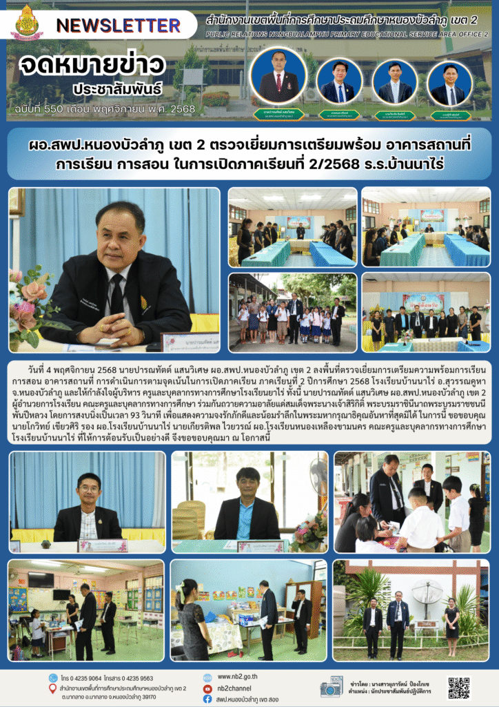 วันที่ 4 พฤศจิกายน 2568 นายปารณทัตต์ แสนวิเศษ ผอ.สพป.หนองบัวลำภู เขต 2 ลงพื้นที่ตรวจเยี่ยมการเตรียมความพร้อมการเรียน การสอน อาคารสถานที่ การดำเนินการตามจุดเน้นในการเปิดภาคเรียน ภาคเรียนที่ 2 ปีการศึกษา 2568 โรงเรียนบ้านนาไร่ อ.สุวรรณคูหา จ.หนองบัวลำภู และให้กำลังใจผู้บริหาร ครูและบุคลากรทางการศึกษาโรงเรียนนาไร่ ทั้งนี้ นายปารณทัตต์ แสนวิเศษ ผอ.สพป.หนองบัวลำภู เขต 2 ผู้อำนวยการโรงเรียน คณะครูและบุคลากรทางการศึกษา ร่วมกันถวายความอาลัยแด่สมเด็จพระนางเจ้าสิริกิติ์ พระบรมราชินีนาถพระบรมราชชนนีพันปีหลวง โดยการสงบนิ่งเป็นเวลา 93 วินาที เพื่อแสดงความจงรักภักดีและน้อมรำลึกในพระมหากรุณาธิคุณอันหาที่สุดมิได้ ในการนี้ ขอขอบคุณ นายโกวิทย์ เขียวศิริ รอง ผอ.โรงเรียนบ้านโคกทุ่งน้อย รักษาการในตำแหน่ง ผอ.โรงเรียนบ้านนาไร่ นายเกียรติพล ไวยวรณ์ ผอ.โรงเรียนหนองเหลืองขามนคร คณะครูและบุคลากรทางการศึกษาโรงเรียนบ้านนาไร่ ที่ให้การต้อนรับเป็นอย่างดี จึงขอขอบคุณมา ณ โอกาสนี้