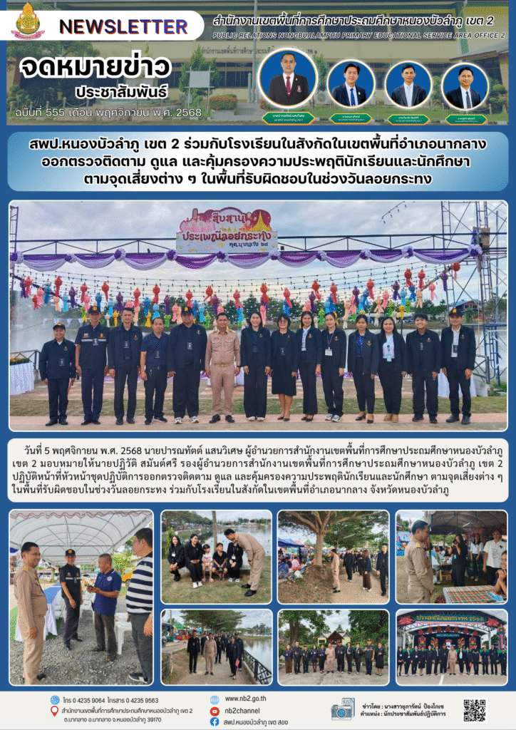วันที่ 5 พฤศจิกายน พ.ศ. 2568 นายปารณทัตต์ แสนวิเศษ ผู้อำนวยการสำนักงานเขตพื้นที่การศึกษาประถมศึกษาหนองบัวลำภู เขต 2 มอบหมายให้นายปฏิวัติ สมันต์ศรี รองผู้อำนวยการสำนักงานเขตพื้นที่การศึกษาประถมศึกษาหนองบัวลำภู เขต 2 ปฏิบัติหน้าที่หัวหน้าชุดปฏิบัติการออกตรวจติดตาม ดูแล และคุ้มครองความประพฤตินักเรียนและนักศึกษา ตามจุดเสี่ยงต่าง ๆ ในพื้นที่รับผิดชอบในช่วงวันลอยกระทง ร่วมกับโรงเรียนในสังกัดในเขตพื้นที่อำเภอนากลาง จังหวัดหนองบัวลำภู