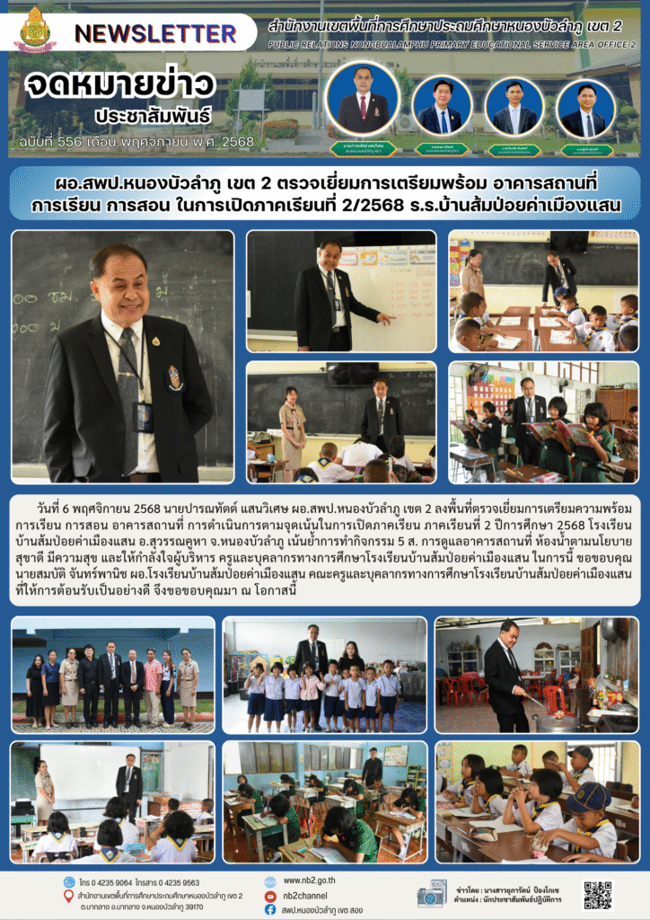 วันที่ 6 พฤศจิกายน 2568 นายปารณทัตต์ แสนวิเศษ ผอ.สพป.หนองบัวลำภู เขต 2 ลงพื้นที่ตรวจเยี่ยมการเตรียมความพร้อมการเรียน การสอน อาคารสถานที่ การดำเนินการตามจุดเน้นในการเปิดภาคเรียน ภาคเรียนที่ 2 ปีการศึกษา 2568 โรงเรียนบ้านส้มป่อยค่าเมืองแสน อ.สุวรรณคูหา จ.หนองบัวลำภู เน้นย้ำการทำกิจกรรม 5 ส. การดูแลอาคารสถานที่ ห้องน้ำตามนโยบายสุขาดี มีความสุข และให้กำลังใจผู้บริหาร ครูและบุคลากรทางการศึกษาโรงเรียนบ้านส้มป่อยค่าเมืองแสน ในการนี้ ขอขอบคุณ นายสมบัติ จันทร์พานิช ผอ.โรงเรียนบ้านส้มป่อยค่าเมืองแสน คณะครูและบุคลากรทางการศึกษาโรงเรียนบ้านส้มป่อยค่าเมืองแสนที่ให้การต้อนรับเป็นอย่างดี จึงขอขอบคุณมา ณ โอกาสนี้