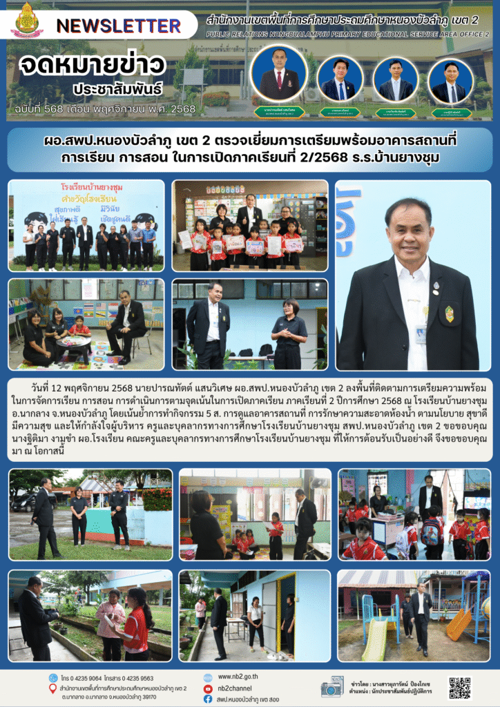 วันที่ 12 พฤศจิกายน 2568 นายปารณทัตต์ แสนวิเศษ ผอ.สพป.หนองบัวลำภู เขต 2 ลงพื้นที่ติดตามการเตรียมความพร้อมในการจัดการเรียน การสอน การดำเนินการตามจุดเน้นในการเปิดภาคเรียน ภาคเรียนที่ 2 ปีการศึกษา 2568 ณ โรงเรียนบ้านยางชุม อ.นากลาง จ.หนองบัวลำภู โดยเน้นย้ำการทำกิจกรรม 5 ส. การดูแลอาคารสถานที่ การรักษาความสะอาดห้องน้ำ ตามนโยบาย สุขาดี มีความสุข และให้กำลังใจผู้บริหาร ครูและบุคลากรทางการศึกษาโรงเรียนบ้านยางชุม สพป.หนองบัวลำภู เขต 2 ขอขอบคุณ นางฐิติมา งามขำ ผอ.โรงเรียน คณะครูและบุคลากรทางการศึกษาโรงเรียนบ้านยางชุม ที่ให้การต้อนรับเป็นอย่างดี จึงขอขอบคุณ มา ณ โอกาสนี้