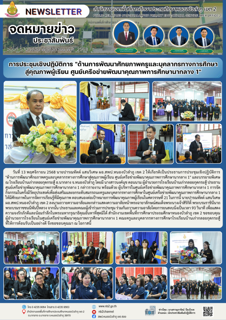 วันที่ 13 พฤศจิกายน 2568 นายปารณทัตต์ แสนวิเศษ ผอ.สพป.หนองบัวลำภู เขต 2 ให้เกียรติเป็นประธานการประชุมเชิงปฏิบัติการ “ด้านการพัฒนาศักยภาพครูและบุคลากรทางการศึกษาสู่คุณภาพผู้เรียน ศูนย์เครือข่ายพัฒนาคุณภาพการศึกษานากลาง 1” และบรรยายพิเศษ ณ โรงเรียนบ้านเก่ากลอยกุดกระสู้ อ.นากลาง จ.หนองบัวลำภู โดยมี นางสาวนงค์นุช ดอนนาม ผู้อำนวยการโรงเรียนบ้านเก่ากลอยกุดกระสู้ ประธานศูนย์เครือข่ายพัฒนาคุณภาพการศึกษานากลาง 1 กล่าวรายงาน พร้อมด้วย ผู้บริหารในศูนย์เครือข่ายพัฒนาคุณภาพการศึกษานากลาง 1 การจัดกิจกรรมในครั้งมีวัตถุประสงค์เพื่อส่งเสริมและยกระดับสมรรถนะครูและบุคลากรทางการศึกษาในศูนย์เครือข่ายพัฒนาคุณภาพการศึกษานากลาง 1 ให้มีศักยภาพในการจัดการเรียนรู้ที่มีคุณภาพ ตอบสนองต่อเป้าหมายการพัฒนาคุณภาพผู้เรียนในศตวรรษที่ 21 ในการนี้ นายปารณทัตต์ แสนวิเศษ ผอ.สพป.หนองบัวลำภู เขต 2 ลงนามถวายความอาลัยและกล่าวแสดงความอาลัยหน้าพระฉายาลักษณ์สมเด็จพระนางเจ้าสิริกิติ์ พระบรมราชินีนาถพระบรมราชชนนีพันปีหลวง จากนั้น ประธานและคณะผู้เข้าร่วมการประชุม ร่วมกันถวานความอาลัยโดยการยนสงบนิ่งเป็นเวลา 93 วินาที เพื่อแสดงความจงรักภักดีและน้อมรำลึกในพระมหากรุณาธิคุณอันหาที่สุดมิได้ สำนักงานเขตพื้นที่การศึกษาประถมศึกษาหนองบัวลำภู เขต 2 ขอขอบคุณผู้อำนวยการโรงเรียนในศูนย์เครือข่ายพัฒนาคุณภาพการศึกษานากลาง 1 คณะครูและบุคลากรทางการศึกษาโรงเรียนบ้านเก่ากลอยกุดกระสู้ที่ให้การต้อนรับเป็นอย่างดี จึงขอขอบคุณมา ณ โอกาสนี้