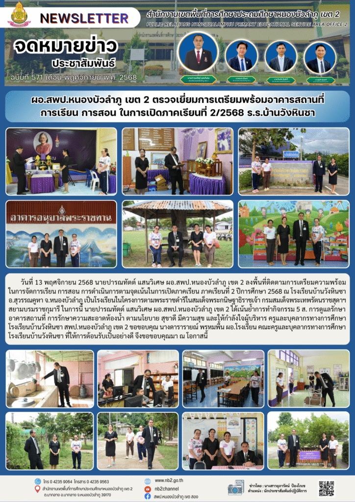 วันที่ 13 พฤศจิกายน 2568 นายปารณทัตต์ แสนวิเศษ ผอ.สพป.หนองบัวลำภู เขต 2 ลงพื้นที่ติดตามการเตรียมความพร้อมในการจัดการเรียน การสอน การดำเนินการตามจุดเน้นในการเปิดภาคเรียน ภาคเรียนที่ 2 ปีการศึกษา 2568 ณ โรงเรียนบ้านวังหินซา อ.สุวรรณคูหา จ.หนองบัวลำภู เป็นโรงเรียนในโครงการตามพระราชดำริในสมเด็จพระกนิษฐาธิราชเจ้า กรมสมเด็จพระเทพรัตนราชสุดาฯ สยามบรมราชกุมารี ในการนี้ นายปารณทัตต์ แสนวิเศษ ผอ.สพป.หนองบัวลำภู เขต 2 ได้เน้นย้ำการทำกิจกรรม 5 ส. การดูแลรักษาอาคารสถานที่ การรักษาความสะอาดห้องน้ำ ตามนโยบาย สุขาดี มีความสุข และให้กำลังใจผู้บริหาร ครูและบุคลากรทางการศึกษาโรงเรียนบ้านวังหินซา สพป.หนองบัวลำภู เขต 2 ขอขอบคุณ นางดารารายณ์ พรหมพื้น ผอ.โรงเรียน คณะครูและบุคลากรทางการศึกษาโรงเรียนบ้านวังหินซา ที่ให้การต้อนรับเป็นอย่างดี จึงขอขอบคุณมา ณ โอกาสนี้