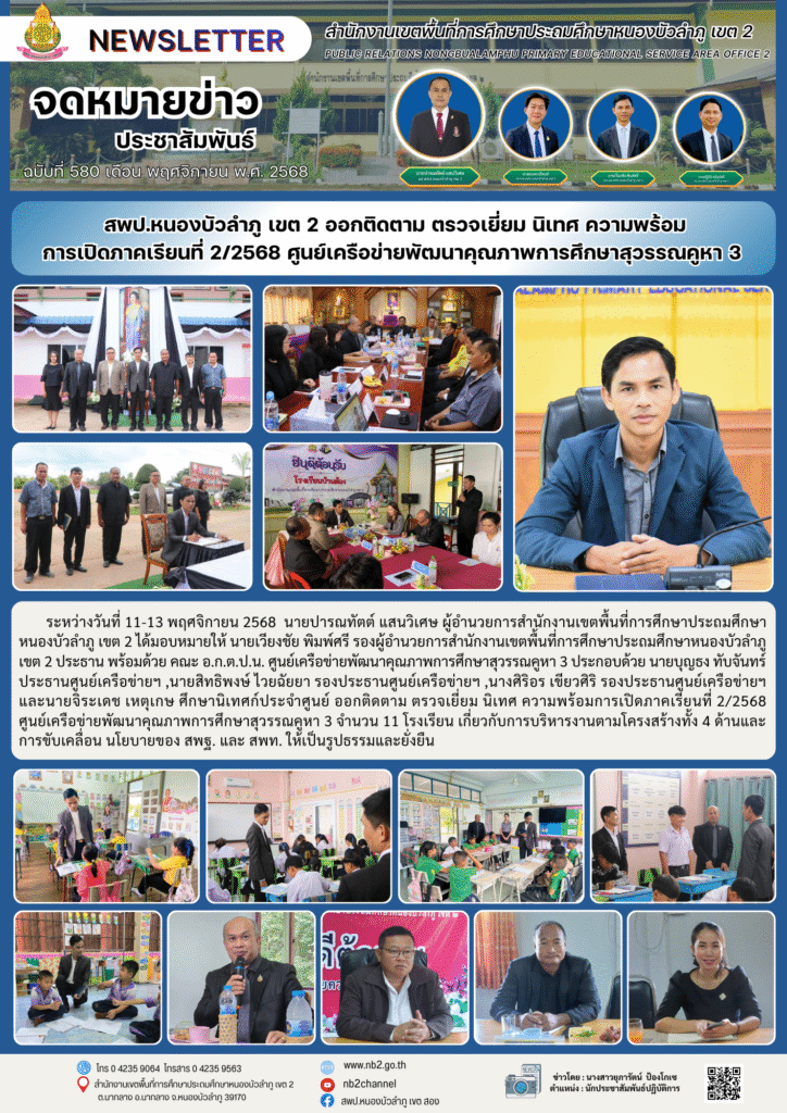 ระหว่างวันที่ 11-13 พฤศจิกายน 2568 นายปารณทัตต์ แสนวิเศษ ผู้อำนวยการสำนักงานเขตพื้นที่การศึกษาประถมศึกษาหนองบัวลำภู เขต 2 ได้มอบหมายให้ นายเวียงชัย พิมพ์ศรี รองผู้อำนวยการสำนักงานเขตพื้นที่การศึกษาประถมศึกษาหนองบัวลำภู เขต 2 ประธาน พร้อมด้วย คณะ อ.ก.ต.ป.น. ศูนย์เครือข่ายพัฒนาคุณภาพการศึกษาสุวรรณคูหา 3 ประกอบด้วย นายบุญธง ทับจันทร์ ประธานศูนย์เครือข่ายฯ ,นายสิทธิพงษ์ ไวยฉัยยา รองประธานศูนย์เครือข่ายฯ ,นางศิริอร เขียวศิริ รองประธานศูนย์เครือข่ายฯ และนายจิระเดช เหตุเกษ ศึกษานิเทศก์ประจำศูนย์ ออกติดตาม ตรวจเยี่ยม นิเทศ ความพร้อมการเปิดภาคเรียนที่ 2/2568 ศูนย์เครือข่ายพัฒนาคุณภาพการศึกษาสุวรรณคูหา 3 จำนวน 11 โรงเรียน เกี่ยวกับการบริหารงานตามโครงสร้างทั้ง 4 ด้านและการขับเคลื่อน นโยบายของ สพฐ. และ สพท. ให้เป็นรูปธรรมและยั่งยืน