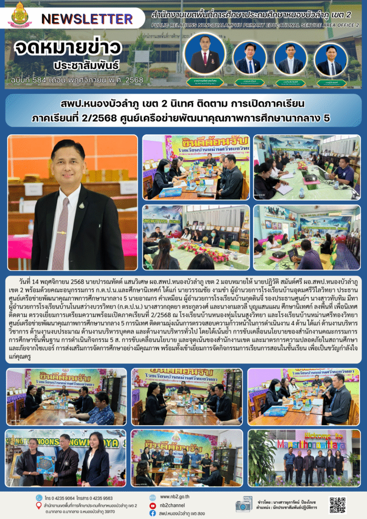 วันที่ 14 พฤศจิกายน 2568 นายปารณทัตต์ แสนวิเศษ ผอ.สพป.หนองบัวลำภู เขต 2 มอบหมายให้ นายปฏิวัติ สมันต์ศรี ผอ.สพป.หนองบัวลำภู เขต 2 พร้อมด้วยคณะอนุกรรมการ ก.ต.ป.น.และศึกษานิเทศก์ ได้แก่ นายวรรณชัย งามขำ ผู้อำนวยการโรงเรียนบ้านอุดมศรีวิไลวิทยา ประธานศูนย์เครือข่ายพัฒนาคุณภาพการศึกษานากลาง 5 นายอาณกร คำเหมือน ผู้อำนวยการโรงเรียนบ้านกุดดินจี่ รองประธานศูนย์ฯ นางสาวทับทิม มีทา ผู้อำนวยการโรงเรียนบ้านโนนสว่างบวรวิทยา (ก.ต.ป.น.) นางสาวกฤตยา ตระกูลวงศ์ และนางกมลวลี บุญแสนแผน ศึกษานิเทศก์ ลงพื้นที่ เพื่อนิเทศ ติดตาม ตรวจเยี่ยมการเตรียมความพร้อมเปิดภาคเรียนที่ 2/2568 ณ โรงเรียนบ้านหนองทุ่มโนนสูงวิทยา และโรงเรียนบ้านหม่านศรีทองวิทยา ศูนย์เตรือข่ายพัฒนาคุณภาพการศึกษานากลาง 5 การนิเทศ ติดตามมุ่งเน้นการตรวจสอบความก้าวหน้าในการดำเนินงาน 4 ด้าน ได้แก่ ด้านงานบริหารวิชาการ ด้านงานงบประมาณ ด้านงานบริหารบุคคล และด้านงานบริหารทั่วไป โดยได้เน้นย้ำ การขับเคลื่อนนโยบายของสำนักงานคณะกรรมการการศึกษาขั้นพื้นฐาน การดำเนินกิจกรรม 5 ส. การขับเคลื่อนนโยบาย และจุดเน้นของสำนักงานเขต และมาตรการความปลอดภัยในสถานศึกษาและภัยจากไซเบอร์ การส่งเสริมการจัดการศึกษาอย่างมีคุณภาพ พร้อมทั้งเข้าเยี่ยมการจัดกิจกรรมการเรียนการสอนในชั้นเรียน เพื่อเป็นขวัญกำลังใจแก่คุณครู