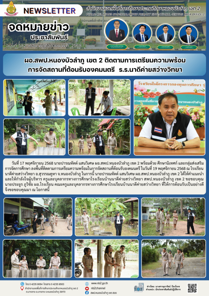 วันที่ 17 พฤศจิกายน 2568 นายปารณทัตต์ แสนวิเศษ ผอ.สพป.หนองบัวลำภู เขต 2 พร้อมด้วย ศึกษานิเทศก์ และกลุ่มส่งเสริมการจัดการศึกษา ลงพื้นที่ติดตามการเตรียมความพร้อมในการจัดสถานที่ต้อนรับองคมนตรี ในวันที่ 19 พฤศจิกายน 2568 ณ โรงเรียนนาดีค่ายสว่างวิทยา อ.สุวรรณคูหา จ.หนองบัวลำภู ในการนี้ นายปารณทัตต์ แสนวิเศษ ผอ.สพป.หนองบัวลำภู เขต 2 ได้ให้คำแนะนำและให้กำลังใจผู้บริหาร ครูและบุคลากรทางการศึกษาโรงเรียนบ้านนาดีค่ายสว่างวิทยา สพป.หนองบัวลำภู เขต 2 ขอขอบคุณ นายประยูร ภูวิชัย ผอ.โรงเรียน คณะครูและบุคลากรทางการศึกษาโรงเรียนบ้านนาดีค่ายสว่างวิทยา ที่ให้การต้อนรับเป็นอย่างดี จึงขอขอบคุณมา ณ โอกาสนี้