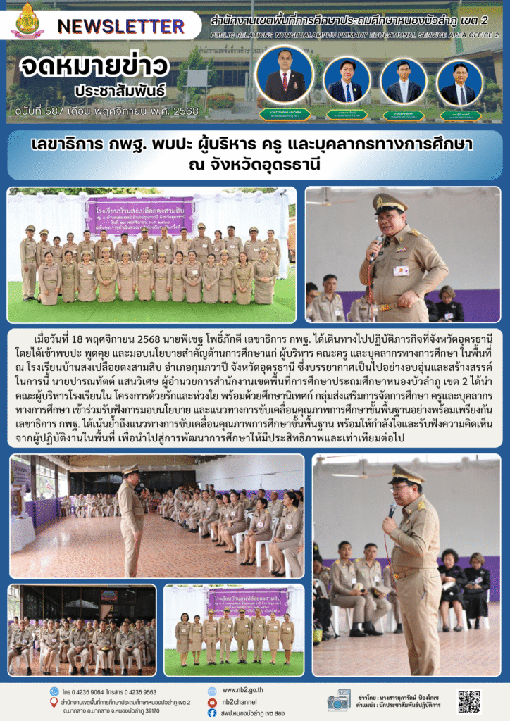 เมื่อวันที่ 18 พฤศจิกายน 2568 นายพิเชฐ โพธิ์ภักดี เลขาธิการ กพฐ. ได้เดินทางไปปฏิบัติภารกิจที่จังหวัดอุดรธานี โดยได้เข้าพบปะ พูดคุย และมอบนโยบายสำคัญด้านการศึกษาแก่ ผู้บริหาร คณะครู และบุคลากรทางการศึกษา ในพื้นที่ ณ โรงเรียนบ้านสงเปลือยดงสามสิบ อำเภอกุมภวาปี จังหวัดอุดรธานี ซึ่งบรรยากาศเป็นไปอย่างอบอุ่นและสร้างสรรค์ ในการนี้ นายปารณทัตต์ แสนวิเศษ ผู้อำนวยการสำนักงานเขตพื้นที่การศึกษาประถมศึกษาหนองบัวลำภู เขต 2 ได้นำคณะผู้บริหารโรงเรียนใน โครงการด้วยรักและห่วงใย พร้อมด้วยศึกษานิเทศก์ กลุ่มส่งเสริมการจัดการศึกษา ครูและบุคลากรทางการศึกษา เข้าร่วมรับฟังการมอบนโยบาย และแนวทางการขับเคลื่อนคุณภาพการศึกษาขั้นพื้นฐานอย่างพร้อมเพรียงกัน เลขาธิการ กพฐ. ได้เน้นย้ำถึงแนวทางการขับเคลื่อนคุณภาพการศึกษาขั้นพื้นฐาน พร้อมให้กำลังใจและรับฟังความคิดเห็นจากผู้ปฏิบัติงานในพื้นที่ เพื่อนำไปสู่การพัฒนาการศึกษาให้มีประสิทธิภาพและเท่าเทียมต่อไป